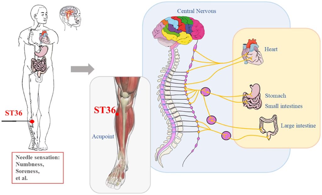 La inserción y manipulación de la aguja de acupuntura estimula estas terminaciones nerviosas en la piel, el tejido conectivo, los músculos y el periostio. Estas señales viajan a través de la médula espinal y ascienden al cerebro, donde se procesan en diversas áreas, incluyendo el tálamo, la corteza somatosensorial, la ínsula y estructuras límbicas (relacionadas con las emociones), lo que podría explicar la naturaleza a veces inusual o emocional de la experiencia del Deqi.