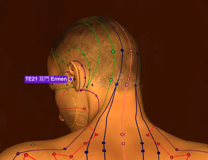 - Ermen (SJ21): Este punto también es conocido como la Puerta del Oído. Se encuentra justo entre la parte superior donde comienza el lóbulo de la oreja y la sien. Aplica suavemente presión y masajea esta área. Puedes encontrar alivio para el dolor facial o de mandíbula asociado con un ataque de migraña.