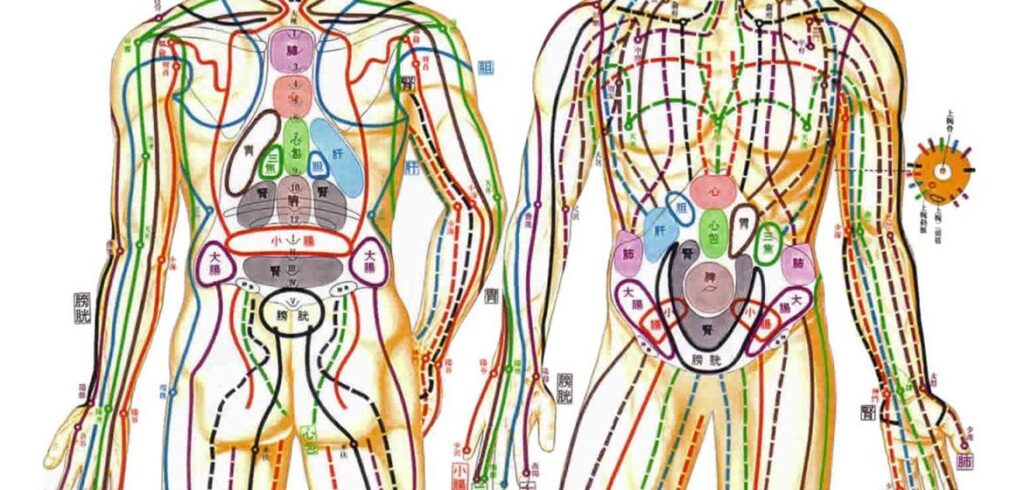 La teoría de los meridianos es un pilar fundamental en la MTC para comprender y tratar el cuerpo humano. Se basa en la creencia de una red de 12 canales meridianos principales bilaterales que recorren el tejido conectivo del cuerpo. Estos 12 caminos principales están asociados cada uno con un órgano específico. Se dividen tradicionalmente en órganos Yin (corazón, pericardio, pulmón, bazo, hígado, riñón) y órganos Yang (estómago, vesícula biliar, intestino grueso y delgado, vejiga urinaria y triple calentador o san jiao).